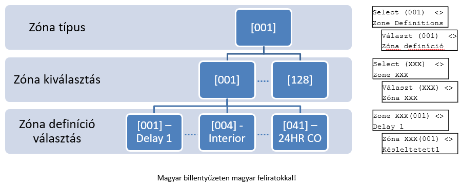A szöveges és érintőképernyős billentyűzetek megjelenítik a zónadefiníciók megnevezését, így nem kell a leírásból kiolvasni a 3 számjegyes számokat.